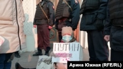 Анастасия Гордиенко из Омска пришла с плакатом "Путин убийца". Её уронили, когда ОМОН стал пододвигать людей, но она снова встала в пикет.